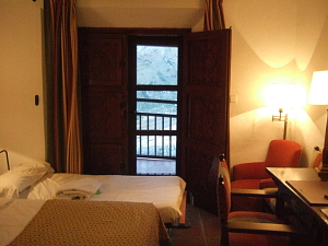 ようやく麓に到達すれば、あとはエンジンをふかして舗装された山道を一路登っていく。 ゲートをくぐった山頂は、砦の一部と見まがうような、パラドールの建物だ。 実は20世紀後半の新しい建物なのだが、景観保護とデザイン性とを考え、城壁と全く同じ作りで建築されているので、その重厚感は中世の城と何ら変わらない。
