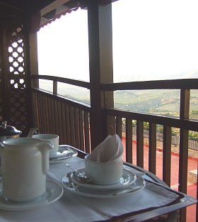 アンティークや騎士の調度品が飾られた、高い天井の作りになっており、まるで古城といった趣きだ。 山頂の地形が東西に長いため、建物も一直線に細長い構造になっている。つまりどの部屋の眺めも素晴らしいのだが、南の山側が特に良く、部屋数としてはテラス付きの南向きの部屋が多い。 北側は町の方向に当たるのだが、山が高く町が足元の方向になるため、恐らく部屋からは見えないだろう。 |