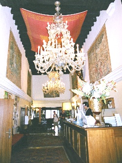 運河に面した玄関に、タクシーは接岸する。木製の桟橋をかねたテラスに上陸し、1階の古めかしいレセプションで手続きをする。こんな手軽なチェックインができるのも、プチホテルの魅力の一つだ。室内は中世の館そのままで、クラシックな調度品で統一された木の梁が暖かい感じだ。水音を感じられる運河側の部屋を取れたなら、明るい水面がひときわ輝かしい。