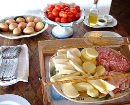 朝食をとりにテラスにあがり、ぶどう棚の下の素朴なラッシュ編みのダイニングチェアーに席を取る。石のテーブルが涼しげだ。 気兼ねないバイキング方式なので、今日の暑い一日に備えて、好きなものを好きなだけ食べておこう。 そのメニューの豊富さは並大抵ではなく、ハム、チーズ、パン、ジュース、ジャム、フルーツなど、それぞれ専用のテーブルが用意されている。しかし素晴らしいのは、その質の良さだ。レストランで出されるレベルの食材や、取りたての新鮮な果物は、いつまでも食べ続けていたくなるほどの美味しさだ。