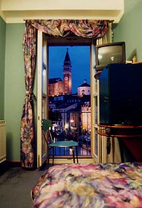 ぎ目の部分に設けられた、台形型の部屋がお勧めだ。狭いツインのつくりではあるが、この部分の部屋だけにつけられた小さなテラスから見おろす景色は絵のように美しい。正面の丘の上には聖ユリイ教会の聖堂と鐘楼、その下に広がるタルティーニ広場を行き交う人々。左手には港の風景。特に夕方、まだ明るさが空に残る時間のライトアップされた町の様子は見飽きることがないほどだ。 |