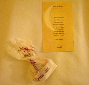 就寝前、部屋に戻ると枕元にはメッセージカードを添えた小さなお菓子が。そんなちょっとした心遣いがもあって、ゆったりとした気持ちで眠りに着くことができる。 |
