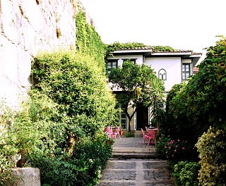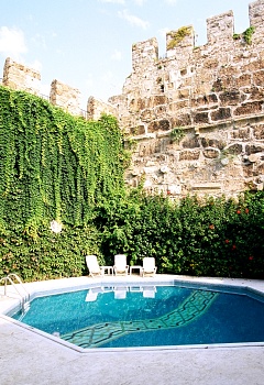 高台の一番海側、港への下り口に位置するのが、このホテルだ。城壁に沿った幾つかの建物全体でホテルとして機能している。城壁を背にしたレセプションの建物で手続きを済ませて、城壁沿いに宿泊棟へと進んでいく。城壁をくぐった右手は誰でも利用できるカフェになっていて、昼には青い海を眺めるカフェで、夜には港の夜景を眺めながらグラスを傾けるバーになる、市内でも人気のスポットだ。 蔦の這う城壁に擁かれたイスラム風デザインのプールの向こうに客室がある。年期の入った懐かしい木造建築をベースに、ピンクを基調にしたトルコ風のインテリアと調度品が備え付けられている。