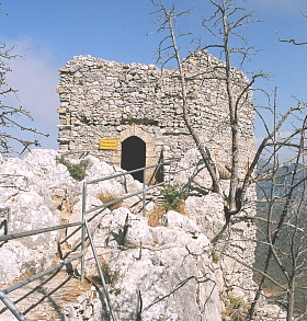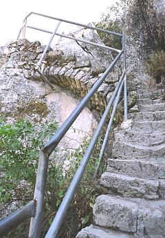 数分の登りで中の部分に着く。ここは王宮の実質的に下半分で、居室の他に、礼拝堂、井戸などが揃っている。 テラスからのキレニアの海岸線の眺めが素晴らしく、木陰にカフェがあるので思わず一休みしたくなるところだ。 この先はそそり立つ岩峰を縫うようにつけられた階段やはしごを上っていく、まるで登山道のような道となり、年配の見学者はかなり苦労するところだ。 十分ほど喘ぎながら急傾斜を登り切ると、ごつごつした稜線の上に出る。