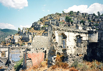 実はカヤキョイは、つい80年程前の1922年までは、賑やかな村であった。歴史は古く、分かっているだけでも紀元前4世紀には遡る。20世紀初頭には、カルミラソス(Karmylassos)と呼ばれるギリシア人が住む村で、3000世帯が暮らしていた。1922年に勃発したギリシア・トルコ戦争でギリシアが破れたため、紀元前から住んでいたトルコ領内のギリシア人はほぼ全員が追放され、村全体が廃墟となってしまったのである。 戦争の悲しい結末を、日常生活の視点で感じることのできる、珍しい遺跡である。 |