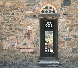 また建物にも特徴がある。冬は雪深いトロードス山中で積雪から守るため、ギリシア正教の十字プランの小聖堂をカバーするように、切妻型の大屋根が設置されている。一見倉庫のようにも見える建物の中に小聖堂があり、さらにその内側のドームや壁一面に素晴らしいフレスコ画が現れるという構造だ。