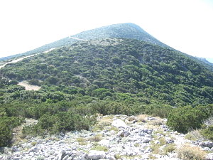 今回は麓の村オソルの観光をかね、オソルからのコースを登ってみた。ツレス島を結ぶ橋の袂から、キャンプ場の中を、道標に従い一直線に山に向かう車道に入る。車道はすぐに未舗装の林道となり、暫くして山に向かう歩道が分かれるのでそれに入る。今回はアプローチ短縮のため車を使ったので、そのまま林道を進んでいった。 クリジッツァ(Kriica)(343M)の東側直下の深いカシの森の中の谷状の地点で、歩道と車道がいったん合流し、登山道はここからガウデント小屋(Dom Gaudent)を経由するものと、クリジッツァに直登するものとに分かれる。