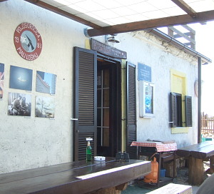 今回は残念ながら、時間の関係で帰路に着き、同じ道を引き返した。帰り道、ブドウ棚の下での涼を求めて、ガウデント小屋に立ち寄り休憩を取った。涼しいテラスから、木々の間にアドリア海の青が背景のように広がる。休憩専用の小屋らしく、ジープで上がってきた管理人が、飲み物の他、簡単な軽食なら出してくれるようだ。