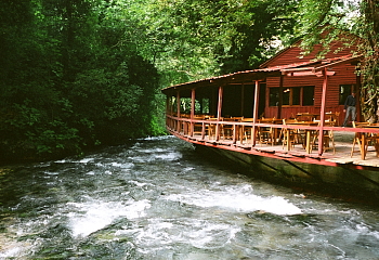 清流の上に設けられたレストランのテラスは、京都の川床桟敷のよう