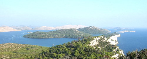 車を1kmちょっと走らすと、ようやくマグロヴィッツァ(Magrovica)浜の水辺が見えてくる。さらに4〜5km走るとグルバシュチャック(Grpaćak)だ。標高146Mの山頂は電波施設があり、360℃の素晴らしい展望だ。細い岬上に突き出た地形の上にあり、海側はこの付近で最大規模の百数十メートルの崖となって落ち込み、反対側は幾何学的に入り組んだ海岸線になっている。ドゥギ島から続くコルナティ諸島の、白い円錐型の島々の連なりが面白い。