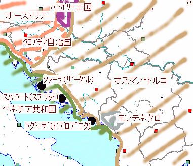 西暦1699年対トルコ戦でのオーストリアの反撃オーストリア軍は反撃に転じ1687年ハンガリーを、1688年セルビアをトルコから解放した。しかしカトリックであるオーストリア支配に対する正教徒であるセルビア人の反感からオーストリアはセルビアの地から撤退する。1699年のカルロバッツ条約で新国境が確定した。オーストリア軍に協力したセルビア人が難民となり周辺諸国に脱出する。 オーストリアはハンガリーを自治王国とし、またトルコとの国境は軍政を敷き直轄地とした。 ベネチアは衰え始めたトルコに戦いを挑み、ダルマチアからギリシアにかけての諸地域で勝利を収め、領土拡張に成功した。しかし海運国家であるベネチアや自治国ラグーザは喜望峰廻りの航路の発展により衰退を始める。 モンテネグロもトルコに対し勝利を収め、若干の拡大に成功する。 |