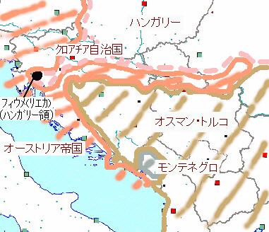 1868年、クロアチアはオーストリア−ハンガリー2重君主制への移行に伴い、再度ハンガリー配下の自治国に戻され、フィウメを失うと同時にハンガリーの圧政が復活する。 1881年にはトルコの衰退に伴い、オーストリア軍直轄地がクロアチアに返還される。ここの住民の多くはセルビア人であり、オーストリア−ハンガリー−クロアチア−セルビア人地域、という4重の支配構造が発生する。この地域が1991年のクロアチア内戦の激戦地になったことは記憶に新しい。 ボスニアのネヴェシニェで1875年に起きた蜂起をきっかけに、トルコ領内の全スラブ人およびモンテネグロ公国(1852年より政教分離)が一斉に立ち上がり、オーストリアの参戦もあり勝利を収める。 その結果バルカン半島の各国は独立するが、セルビアも北部をほぼ回復して王国として独立、モンテネグロも独立を承認されて領土を拡大し、アドリア海への出口である念願のバール港を手に入れる。しかしオーストリアの影響はますます強くなり、セルビアやモンテネグロを影響下におき、ボスニア・ヘルツェゴビナ全域とモンテネグロ北部は、トルコの名目上の宗主権を認めながら事実上オーストリアが併合する。 |