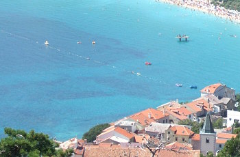 今はすっかり寂れてしまった山に向かう旧市街の一番上の、聖イヴァナ・クルスティテリャ(Sv.Ivana Krstitelja)教会から町を見下ろせば、白い山と白砂と青い海とのコントラストが美しい[写真下]。