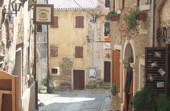 起伏の激しい丘陵が覆うイストラ半島北西部の山中には、クロアチア領となったイタリア的な小さな村が点在している。
