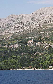 村から数キロ奥、海上152メートルの岩の上にサンフランチェスコ修道院と、ゴスパ・オド・アンジェラ(Gospa od Anđela、天使の聖母)教会とが立っている【写真】。船乗りはその下を通過するときに汽笛を3回鳴らして挨拶し、教会は鐘の音で答礼するという習慣がある。おそらく航海が命がけだった時代に、安全を祈願して始まったのであろう。英国人作家シートン・ワトソンによれば、ここからの眺めは世界で最も美しいものの一つであるそうだ。