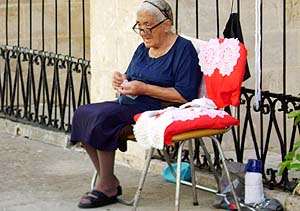 小さな村なので地図は要らない。歩行者専用のメインの大通りの両脇には、カフェ、レース店、地元の物産店が連なり、パフォスやレメソスからのツアーバスが着いた直後は特に賑わう。突き当たりの素朴な造りの教会の左奥、ワイン醸造所に向かう路地にもレースやワインを売る地元のショップが点在する。人影も無い脇道に入り、白塗りの家や壁とカラフルな門扉のコントラストを楽しむのも良い。