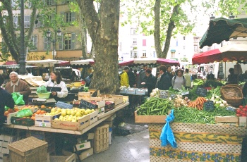 幅数百メートルの旧市街には、中世の邸宅、公館、噴水、時計塔などのモニュメントが、ほどよく散りばめられている。土産物を探したり、リシェルム広場の青空市[写真下]を覗きながら、サンソヴール大聖堂まで散策してみよう。