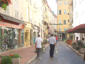 広場の先を下っていくと、向こうの丘との間の谷に沿ったジャン・オッソーラ通り(Rue Jean Ossola)に突き当たる。この谷間の道は、途中で名前を変えながら町の中心を通過しており、香水や土産物の洒落たショップが点在する、観光客にとってのメインストリートだ。