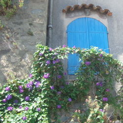 村の道は、まるでとぐろを巻いたような形をしており、旧市街の外周を反時計回りに緩く登って行く。丘の頂上に向かって高い家の壁に、色とりどりの花が咲き競う。