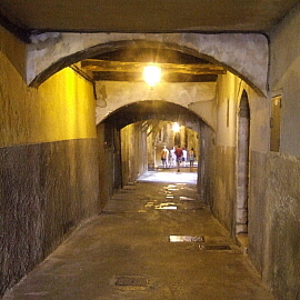 途中から海側に一段下がって並走する、オブスキュール通りに下りてみよう。 夏の日差しや冬の風を遮るためだろう、隣り合わせに立つ町の家々の1階部分をくり貫いて作られた通りは、完全にトンネルになっており、昼でも電灯がついている。 このあたりは14世紀の市街がそのまま残る、歴史的にも貴重な地区だ。