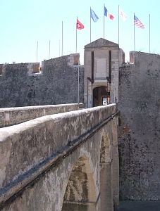 海沿いの小さな丘の上にサンテルム要塞がある。16世紀、サヴォワ公国時代に作られたもので、現在は誰でも入ることができる。 ものものしい跳ね橋(現在はコンクリートで固められている)を渡って場内に入ると、中は町役場や美術館などの公共施設として小奇麗に整備されている。 ここから眺める海は、外に広く開けており、また違った印象だ。マジョルカ焼風の四色の瓦と木々の緑が、一面の青に良く映える。