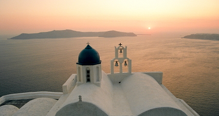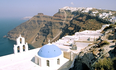 抜約300メートル以上の赤茶けた断崖上に町が展開するサントリーニ島。観光地として世界的に有名になった今、中心地フィラは、まるで町全体がカフェやショップと化したような有様で、観光客で溢れ喧騒に包まれるようになってきた。