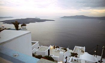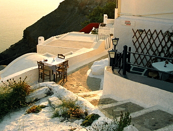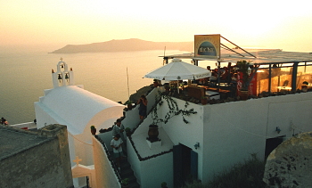 の最高地点にあるレストラン・カフェ「ブルーノート(Blue Note)」からの眺めは、言葉にできないほどの素晴らしさだ。南にフィラの町、北にイアの町、前方にスカロス(Skaros)の岩山、その隙間を埋めるような海、ここで日没時の夢のような時間を過ごすのは、何にも換えがたい。