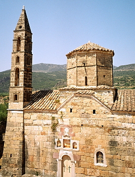 海に向かって村を見下ろす高台が広場になっている。右側には、素朴な彫刻模様のある細長い鐘楼が美しい18世紀初頭の聖スピリドン教会(Ag.Spiridon)[写真下]が、今もって美しい姿を保っている。聖スピリドンはコルフ市の守護聖人だ。