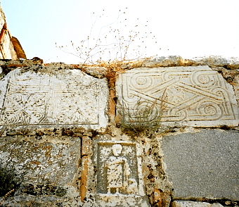 その外観はパーツとなった様々の石の色を繁栄してモザイクのようで、この教会を特徴づけている。白い大理石をよく見ると丹念に彫刻されており、古代ローマの墓石の再利用であることが分かる。