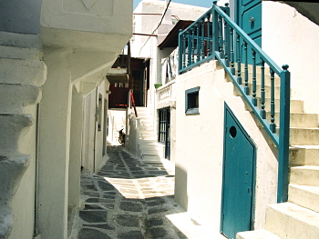 ミコノスの町は美しい。どこから見ても一枚の絵を切り取ったような光景の連続だ。山から眺めても、海から眺めても、また町の中を歩いても、素晴らしいショットが連続する。基本要素は、海と空の青、建物に塗りたくられた石灰の白、その白壁を飾る強い色彩の扉・窓枠・花の色、強い太陽の陽射し、迷路のような路地、草も疎らな白っぽい土。これらが組み合わさって、何万通りもの絵画を作り出している。
