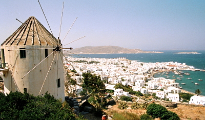アノ・ミリでの風景も十分に絶景であるが、さらに港を前方に見て右手の方向に回り込むと、絵葉書やカレンダーで定番の、ミコノスの町や港、カト・ミリ(下の風車)を眼下にし、エーゲ海をバックにデロス島まで広がる、言葉にできないほど美しい風景が一面に広がる。