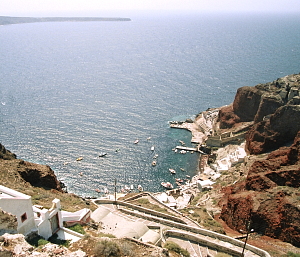 やがて眼下に港が見えてくる。フィラの町と同じく、港から町までは、果てしない石段を歩いて登ることになる。荷物がロバで運ばれていくのも同じだ。