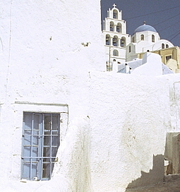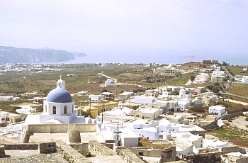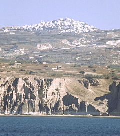 ントリー二島の玄関口フィラの町でカルデラの素晴らしい景色を眺めていると、約8km南の高い山の頂近くにある町の存在に気づくはずだ。それがピルゴスの町だ。 標高550メートルで島一番の高所にある町は、ヴェネチア領時代には島の中心地であった。町のてっぺんにある当時の城塞跡を取り囲むように、古びた白い町並みが広がっている。 旧市街にはホテルや飲食店が少なく、観光化の洗礼を受けずに美しい姿を保っている。城塞からの眺めは、島全体を見渡す360度の絶景だ。