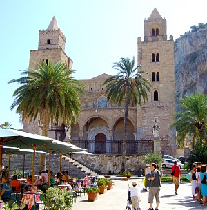 チェファルーを訪れたら、まずは大聖堂を訪れたい。12世紀のノルマン様式の2本の鐘楼を擁する堂々たる雄姿は、街を象徴するのにふさわしい大建築だ。大ドーム下の厳しい表情で我々を見つめる全能のキリストの金に輝くモザイクは必見だ。