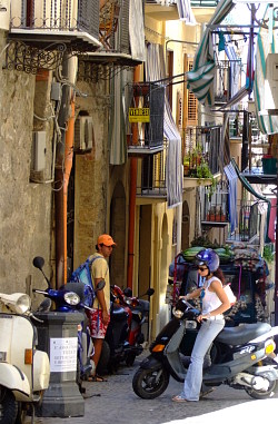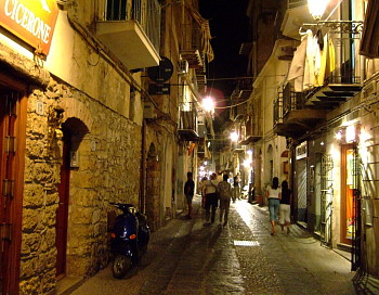 大聖堂前のドゥオーモ広場一帯は、中世の町がそのまま残された貴重な空間で、市民が日用品や食料品を買う商店や、短冊状の細い生活感の漂う路地が連なっている。夏の間は、日中ビーチで過ごした人々が繰り出す夜には、飲食店や土産物屋が店を開きたいそう賑やかになる。