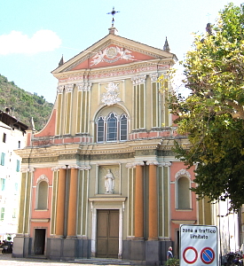山の中腹から川面にかけて、中世の古い家々が密集し、最上部には村を支配するかのように、お世辞にも優雅とは言えない砦のような城が、覆い被さっている。 歩道橋の階段を上るかのような傾斜のきつい太鼓橋を渡ると、いよいよ旧市街だ。 右手には、典型的なリグリア風の地区教会、サンタントニオ・アバテ教会があり、旧市街で唯一陽光に溢れる一角を作り出している。 |