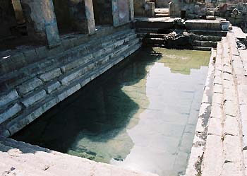 現在遺跡での入浴は出来ないが、源泉から流れ出る豊富な湯は、古代の浴槽からあふれてフェンスの外へと流れ出ており、そこに設置された温泉を地元の主婦が洗濯などに利用している[写真左下]。入浴したければ、300mほど先の木陰にある共同浴場のような建物が利用できる[写真右下]。個室がいくつか並んでいて、事務所で鍵を借りて利用する。イタリアの温泉は高級療養施設としてホテルに組みこまれているものが多いが、このように気軽に利用できる温泉は貴重だ。