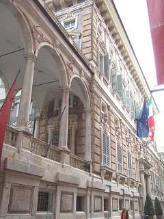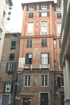 しかしその様子は、まるで雑居ビル街のようであり、およそイタリアの芸術的で優美なイメージとは、かけ離れている。 いかにも、利益や実用を重視したジェノヴァらしい光景ともいえるだろう。 真髄は、建物の外装に表れている。外壁の装飾や、場合によっては窓までもが本物ではない。何もない単なる外壁の平面上に、陰影をつけて見事に立体的にペイントされた「絵」で済ましている[右の写真]。この風習は、州内の小さな町でも見られる、リグリアで特徴的なものだ。