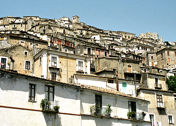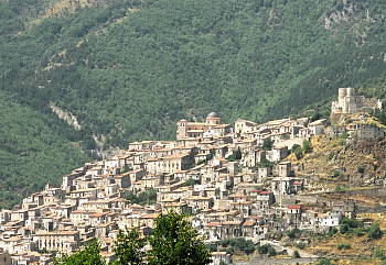 の斜面を覆い尽くす町、遠目に見るとそれは異様な光景だ。 ナポリとシチリアとを結ぶ高速道路をモラーノ・カラーブロで下り、町へとまっすぐ進む。あたりはポリーノ山の緑に包まれた静かな一帯だ。山々の緑を背に、谷間にある円錐型の白っぽい小さな丘が目を奪う。よく見るとそれは、山頂の城を頭に抱いて丘を覆い尽くす明るいグレーの石で築かれた街の姿なのである。