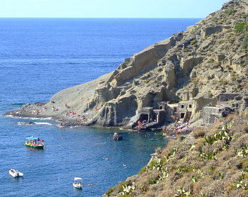 サリーナ島はミラノ、ローマ、どこから行くにしても不便なエオリエ諸島の離島だが、さらに港からバスで30分はかかる一番奥まったところにある、わずか20〜30戸の小さな村がポッラーラだ。標高962メートルのフォッサ・デッレ・フェルチ山(Monte Fossa delle Felci)から海に落ち込む急斜面の傾斜が緩んだ肩のような緑の窪地に静かに広がっている。峠越えのバスが、一気に海に向かって下っていくとき、その様子が手にとるようにわかる【写真上】。