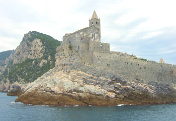 岩礁に立つ白と黒の横縞が特徴であるジェノヴァ風のサン・ピエトロ教会の中に入ると、内部は殺風景である一方、回廊から素晴らしい海の眺望が得られ、それが祈りの場というよりも見張り台であることが強く感じられる。
