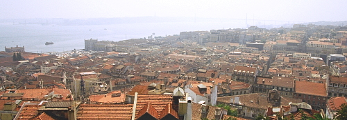 丘の頂にあるサゥン・ジョルジュ城(Castelo de São Jorge)では、2kmの川幅があるテージュ川に掛かる4月25日橋や対岸の白い大キリスト像クリシュトゥ・レイ(Cristo Rei)まで広がる大展望が待っている。