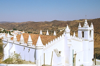 真っ白に塗られた聖母昇天(Nossa Senhora da Assunção、ノッサ・シニョーラ・ダ・アスンサゥン)教会[写真上]の、屋根に見られる尖形の装飾、聖堂内の等間隔の柱やミフラブは、モスクそのものだ。