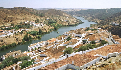 城壁から見下ろす川とグアディアナ渓谷国立公園の緑の大地が、赤屋根の家々と美しいコントラストをなしている[写真下]。