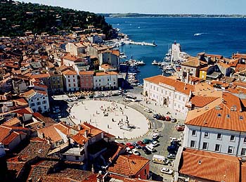 ポルトロージュから海岸沿いに車を走らせていくと、左手にピランの小さな全容が見えてくる。ここにゲートがあり、この先の一般車の進入は規制されている。やがて漁港が見えてきて、港の一番奥の部分に面して町の中心タルティーニ広場(Tartinijev Trg)が現れる。この町出身の18世紀の有名なバイオリニスト、ジュセッペ・タルティーニにその名の起源をもつ円形の広場で、真っ白な大理石が敷き詰められており、その周りを取り囲むヴェネチア時代のパラッツォの奥の高台には、聖ユリイ(Sv.Jurij)教会と鐘楼が見える。旧ヴェネチア領内の教会の鐘楼はしばしば首都ヴェネチアのサンマルコ広場の鐘楼を模して作られているがここも例外ではない。鐘楼の上まで上がってみる。真っ青なアドリア海と町のオレンジの屋根、それにタルティーニ広場の白い大理石とのコントラストが美しい。内陸国スロヴェニアの海岸線は大変短く、港越しに見える陸地はもう隣国のクロアチアだ。 |