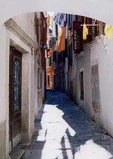 イストラ半島の海岸沿いに点在する、ベネチア共和国領時代の港町。その中でもピランは最も忠実にヴェネチア時代を伝える街だ。小さな岬状の狭い土地の上に開かれた町は、運河の町ヴェネチアと立地が酷似している。狭い路地を覆い被さるように立ち並ぶ建物、その中にぽっかり現れる小広場、そして東方風の建築デザイン。 |