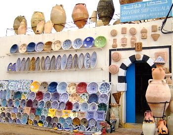 鮮やかな青、黄、赤などを使った細かい模様が特徴のチュニジア陶器の産地の一つが、ジェルバ島南部の村クラーラ(フランス語でゲララ)だ。本来は赤土で作った素焼の壷などが作られていたが、今では観光用にいろいろな種類の陶器が作られている。街道から外れた小さな村だが、交差点付近には買い物に訪れる観光客目当てに、10軒ほどの店が立ち並ぶ。他の町で買うよりも種類やサイズが豊富で在庫も十分なので、じっくり品定めしたいならわざわざ訪れる価値がある。また近くの民族博物館は、ジェルバの生活や文化を知るにはうってつけの立派なものなので、ぜひ寄ってみたい。