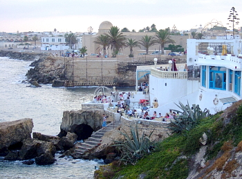 この先は道の両側に白い家々とチュニジアンブルーの扉が美しい、住宅街となる。人目を避けるようにヴェールを被って歩く年配の女性がいると思えば、Tシャツとジーンズで友達と楽しそうに話しながら歩く若い女性もいる。住宅街の中ほど、岬で一番高い地点に、ボルジュ・エル・ケビル(Borj El Kebir)【写真3】がある。トルコ時代の16世紀に新設された要塞で、ここからの眺めも素晴らしい。一息入れるには、海岸沿いのカフェ、シディ・サレム(Sidi Salem)【写真4】がお勧めだ。地中海に張り出した岩礁の上にオープンエアのテーブルが並んでおり、海越しに町の眺めが良い。