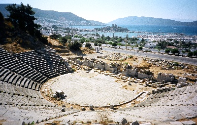 さらに緩い丘を登っていくと港の景色を見下ろすようになってくる。この斜面にマウソロス王国時代のギリシア劇場が残されている。そこから見る、城と港とエーゲ海、そしてレシャディエ半島からコス島(ギリシア領)へと展開する景色は、2500年の歴史を一度に感じることが出来る絶景のポイントだ。