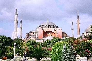 その向かいの赤い大きな建物は537年に当時の超大国ローマ最大の教会として建造されたAyasofya[アヤ・ソフィア(アギア・ソフィア)]だ。東方教会の主としてカトリックと対峙しながら権勢を誇ったが、トルコ時代にはモスクに改装されモザイクは塗り固められた。トルコ革命後、博物館となり、キリストとイスラムの同居した奇妙な空間を見学することが出来るが、壮大なスケールに僅かに往時の面影を感じることができる。現在アギア・ソフィアを追われたコンスタンティノポリス大司教は、イスタンブールの片隅のフェネル地区から、名目上ではあるが全世界を治めている。